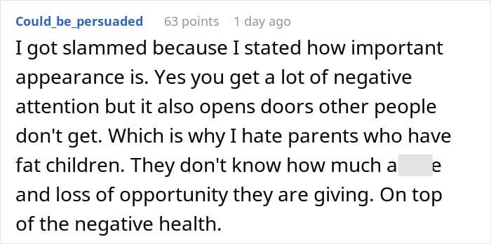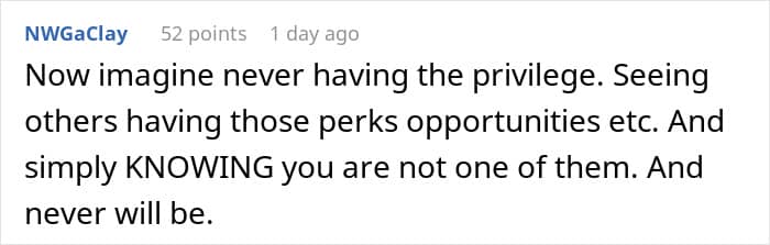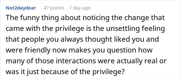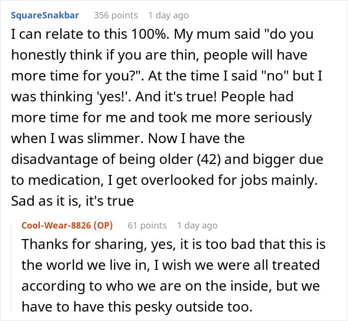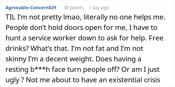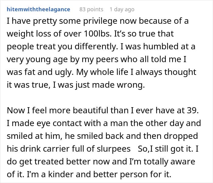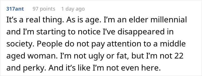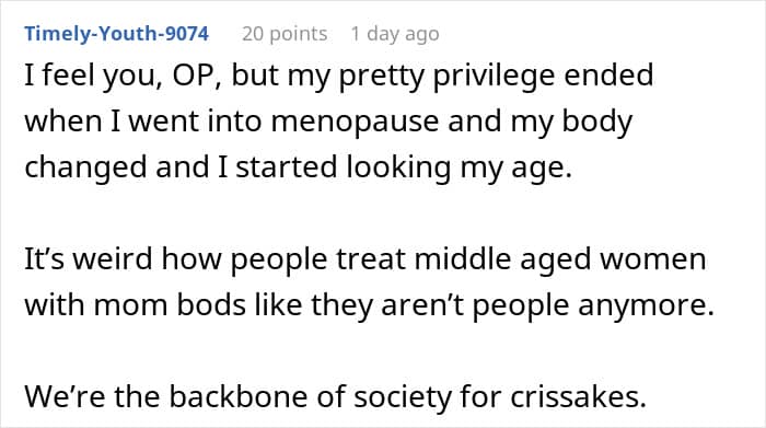 “I think the first thing for anyone with pretty privilege to do is to make an effort to notice when this is happening. Then one can realize that they are being treated differently, preferentially, to others for the simple reason of looking a certain way at a certain age. This isn’t fair, and it isn’t right, but that’s the way our society is,” u/Cool-Wear-8826 told us.