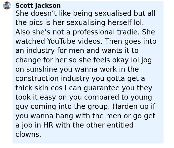A young woman was forced to leave her dream job in construction after enduring degrading comments from men.