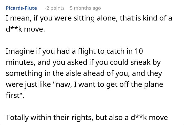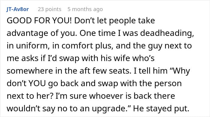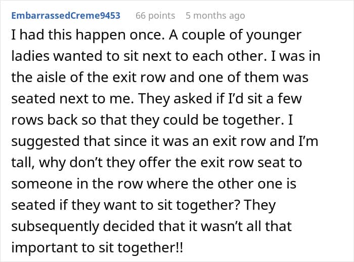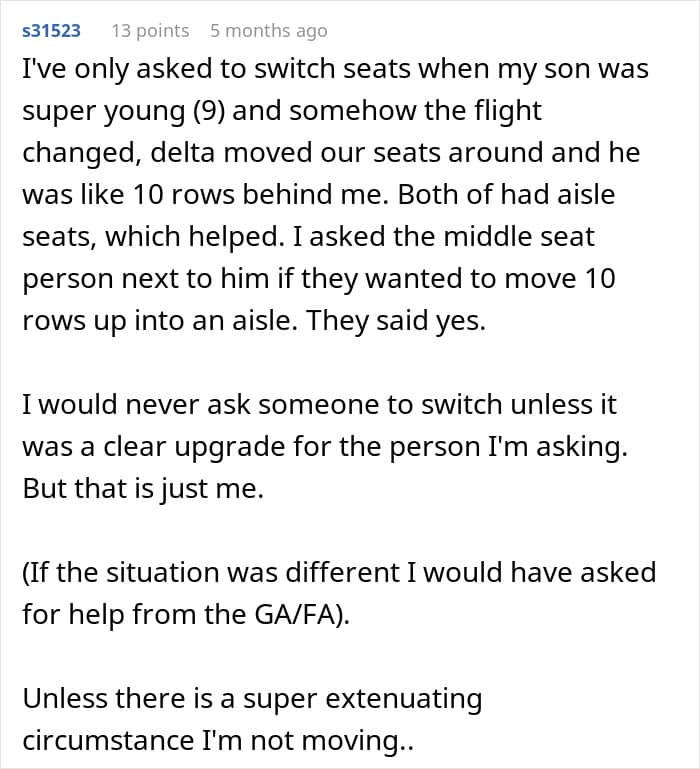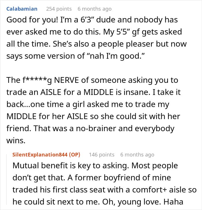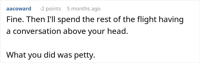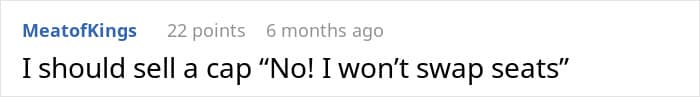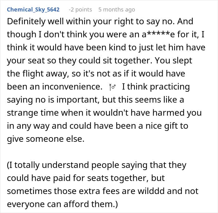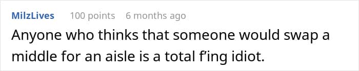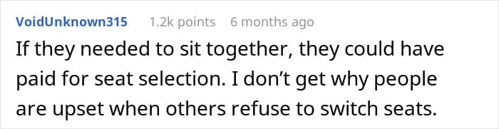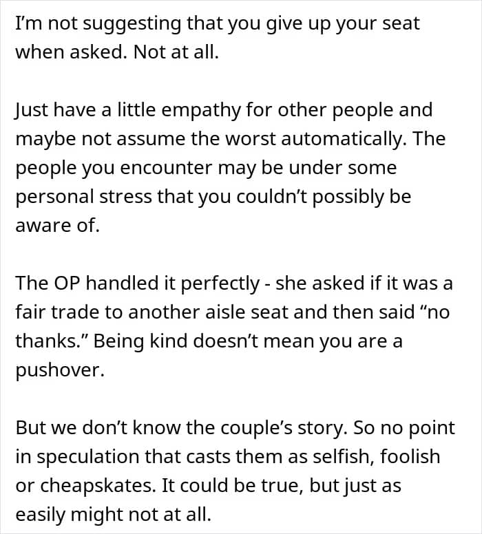 The problem? Expecting someone to give up their seat like it’s an obligation. When that person declines, they’re suddenly the bad person. Guilt-tripping someone into switching is not only unfair, it’s entitled. You never know what someone went through to get that seat: they may have anxiety, joint pain, or simply booked early for comfort. Their no isn’t rude, it’s valid.