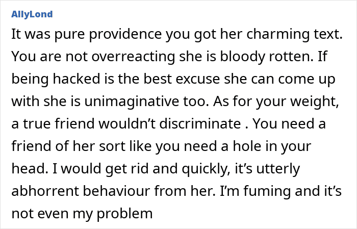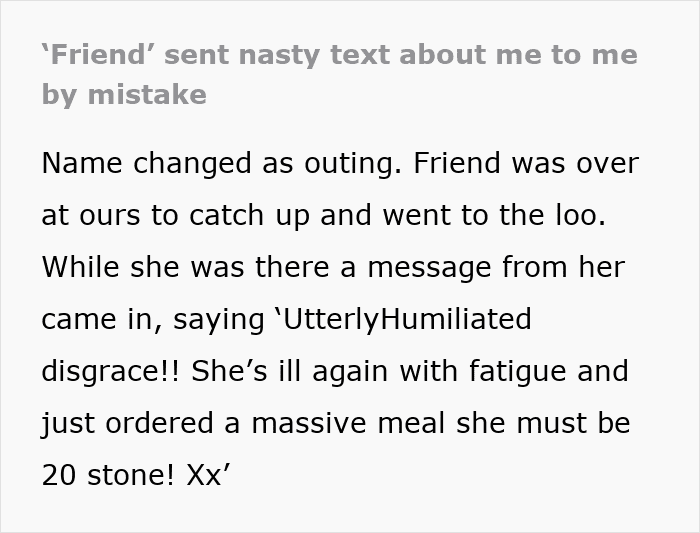 Like this woman, who got an “accidental” text from her friend shaming her about her weight. As she was already in a vulnerable state, the woman wasn’t sure how to react. So, she decided to get opinions from the internet: was the friend’s comment inappropriate or was she just blowing things out of proportion?