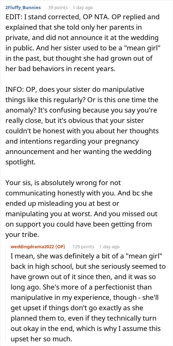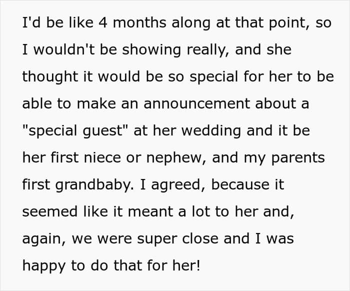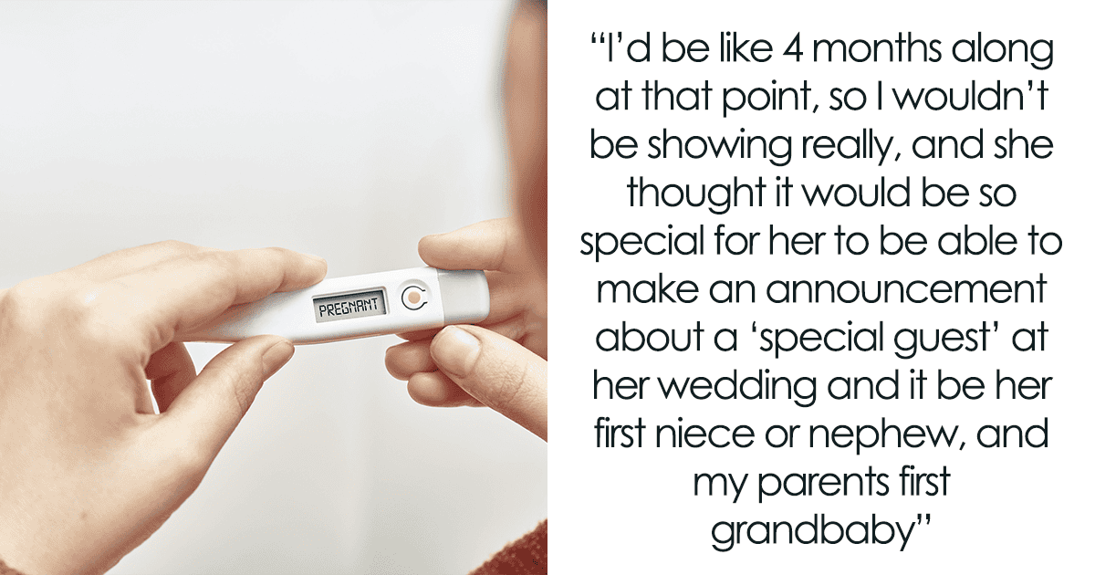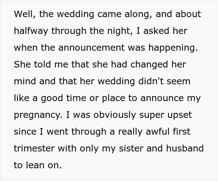 So, the Original Poster (OP) says that she has always been very close to her younger sister, so she was the first (with the exception of her husband, of course) to find out about her pregnancy. Naturally, the sister was overjoyed and suggested that the mother-to-be should announce her pregnancy at the sister’s upcoming wedding. And this, in turn, meant that for the entire first trimester, the OP would not tell anyone about the upcoming addition to her family.