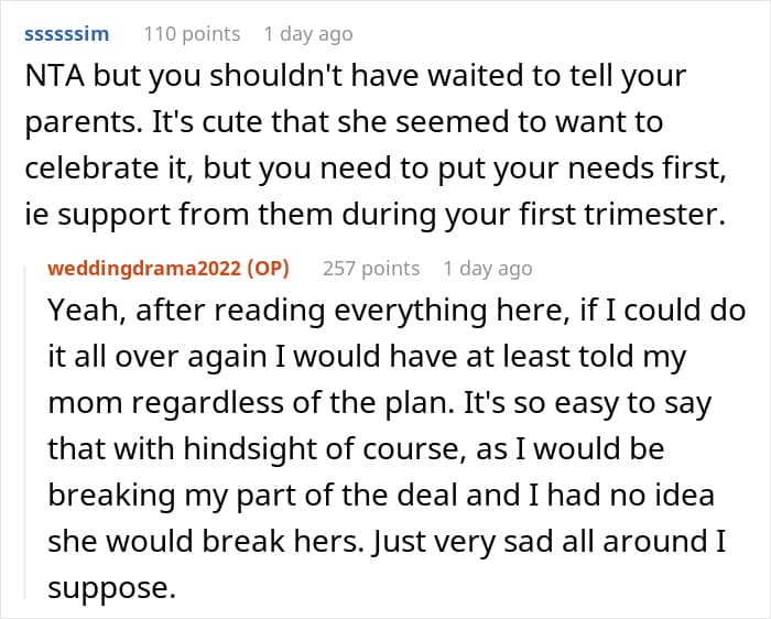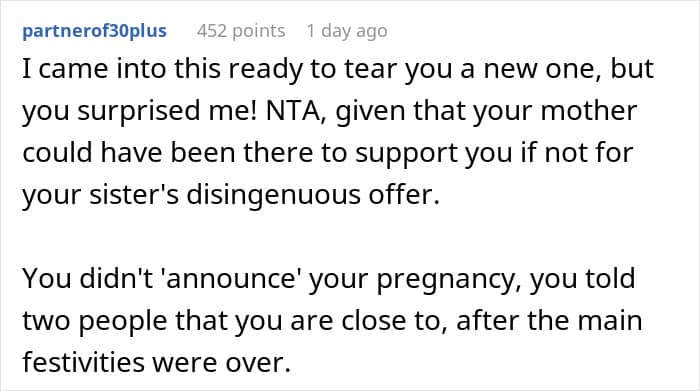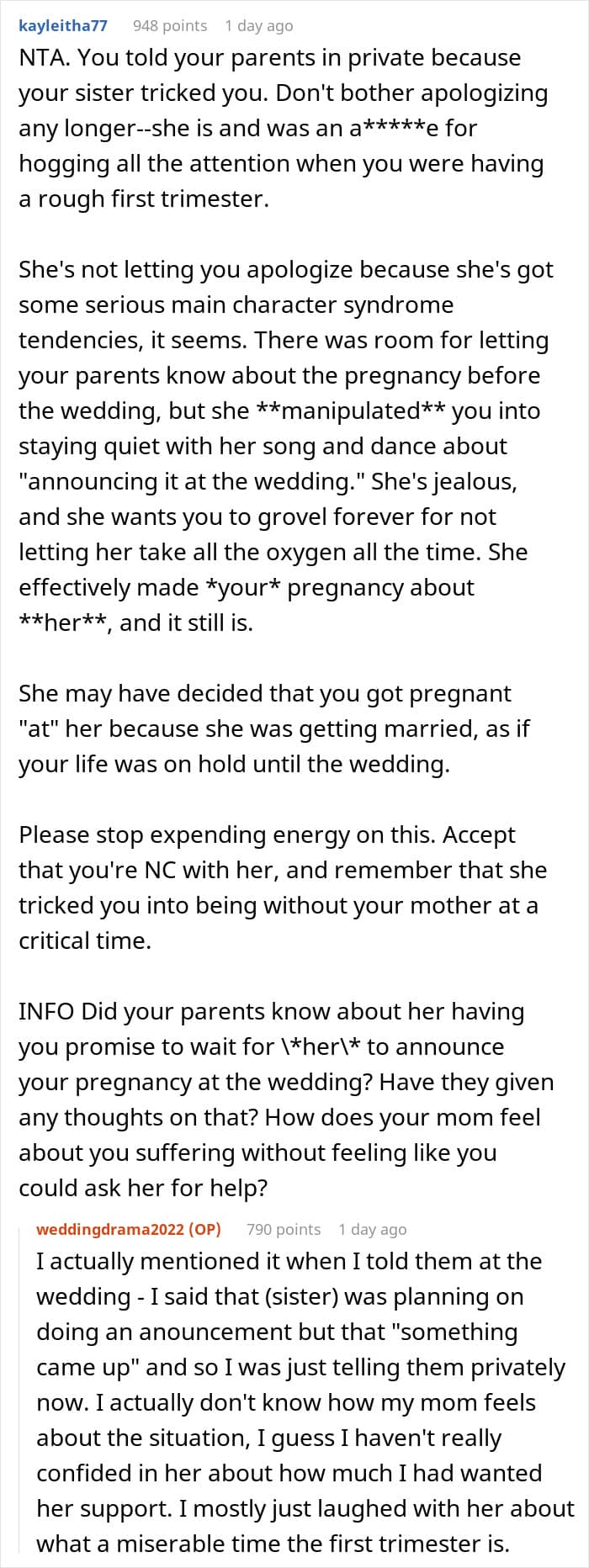 People in the comments also sided with the Original Poster, arguing that she was not really at fault and shouldn’t have to apologize for anything. After all, it was her sister’s own idea, and it was the bride-to-be that actually framed the OP, forcing her to go through a difficult first trimester of pregnancy without any mental support from parents and friends. “Please stop expending energy on this. Remember that she tricked you into being without your mother at a critical time,” people in the comments wrote.