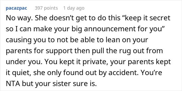 The author of the post got pregnant, but her sister asked her to postpone this announcement until her upcoming wedding