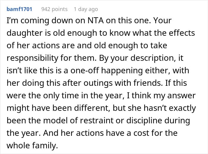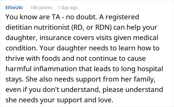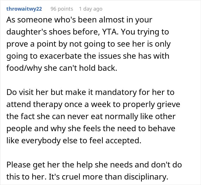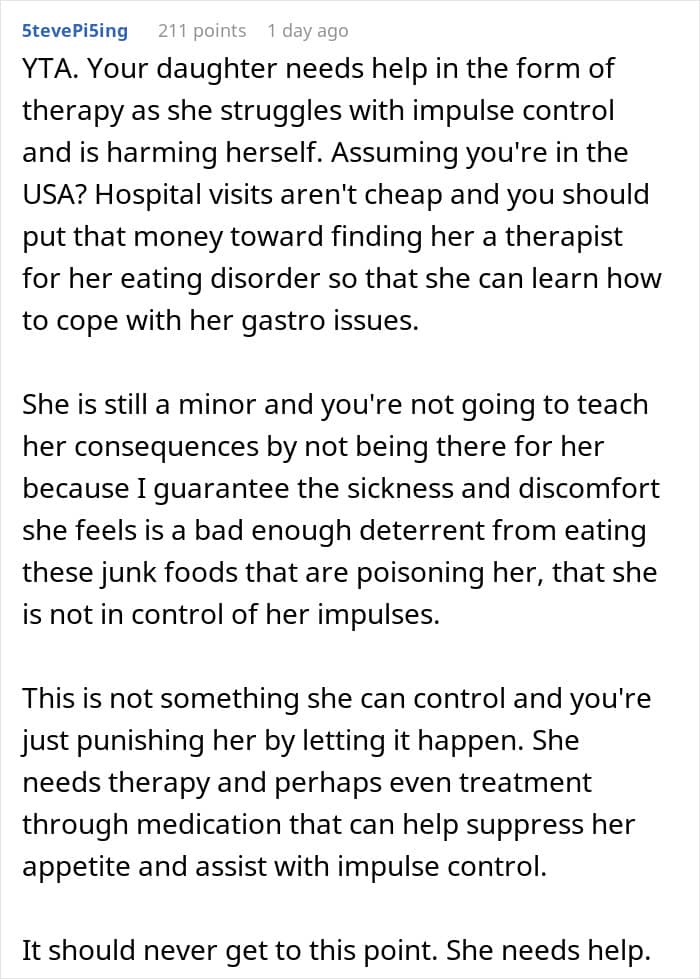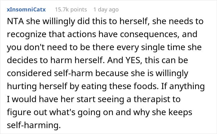 Some even suggested that the daughter seek professional help, as this behavior could be considered self-harm or a potentially sign of an eating disorder