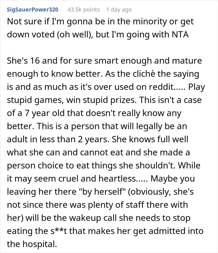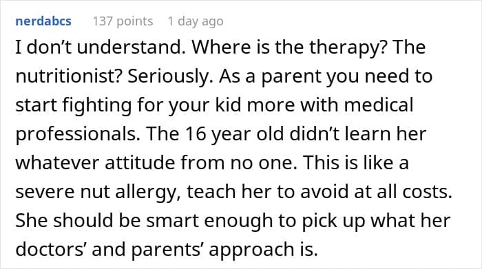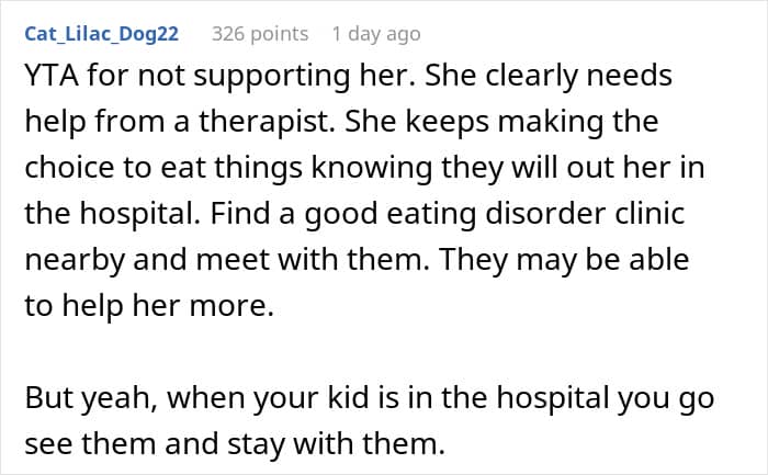 I can’t imagine how painful it must be to see your daughter struggle with constantly becoming ill like this, but at some point she has to learn her lesson. Her illness this time was preventable, and it would not have been fair for her mother’s Christmas to be ruined by spending time in the hospital just because someone wanted to eat all of her trigger foods. As some readers pointed out, it might be time to see a therapist and try to get this illness, or potentially anxiety-induced sickness, under control. 16 is old enough to start taking accountability. We would love to hear your thoughts on this situation in the comments down below, pandas. Do you think the mother should have stayed by her daughter’s side, or do you think it was time to show some tough love?