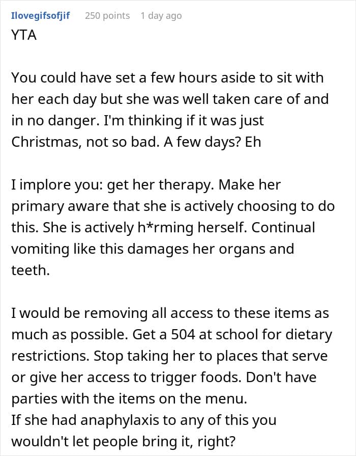 For many of us, the food is a huge part of the celebration on Christmas. Roasted turkey, tamales, gingerbread cookies, pecan pie, macaroni and cheese, mashed potatoes, green bean casserole, hot chocolate, and more. So I completely understand why this teenager would want to experience the holiday to the fullest. But ending up in the hospital is not a merry way to spend your Christmas, and unfortunately, as many of the commenters pointed out, 16 is old enough to understand that our actions have consequences. She has a history of experiencing severe illness after eating trigger foods, so why would she want to go through the torture of becoming violently ill yet again?