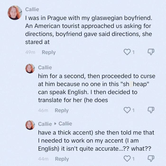 So one TikToker gathers all the stories her viewer’s share of bizarre encounters with American tourists who often do not understand that being in a foreign country means things are done differently. Prepare to laugh and roll your eyes as you scroll through and be sure to upvote your favorites and comment your own experiences below.