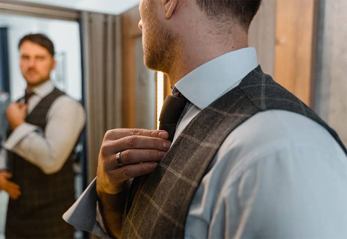 We were in the bathroom getting showered and dressed for a friend’s wedding. I was in the best shape of my life at the time, feeling good about myself, and I thought I looked good in that suit.