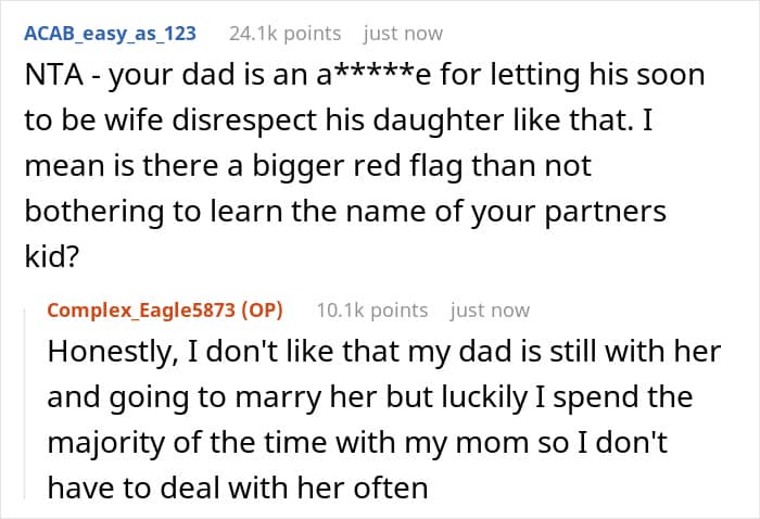 By the way, many commenters are in solidarity with the expert about the fact that the father did not act very well in the case described, in fact, abstracting from the problem. Moreover, people in the comments did not mince words about the original poster’s father letting his fiancée actually disrespect her. “I mean, is there a bigger red flag than not bothering to learn the name of your partner’s kid?” one commenter aptly pondered.