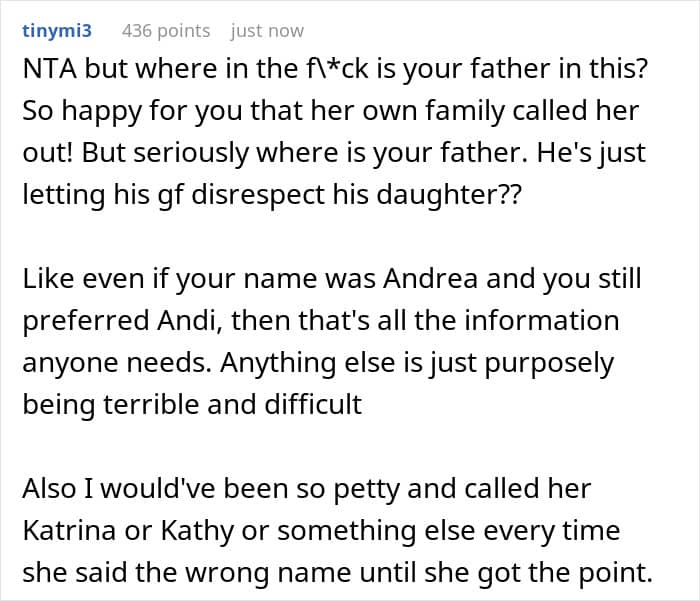 The teen said several times that her name is Andi and nothing else, but all these explanations were to no avail. The girl’s mother gave her sage advice just to ignore Kate if she addresses her wrongly. This is exactly what the OP did during an extended family gathering, when Kate called her Andrea again in front of her own relatives.
