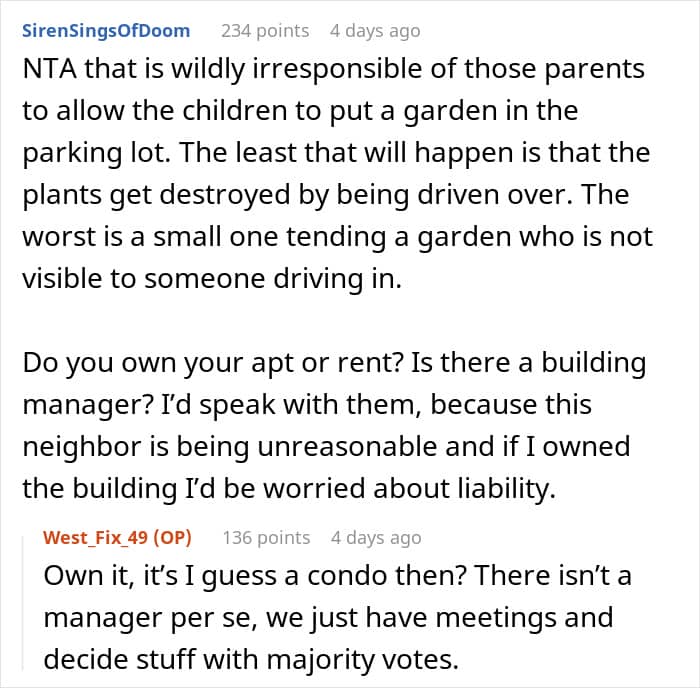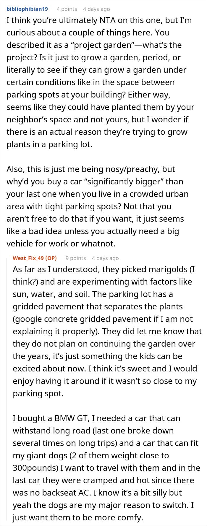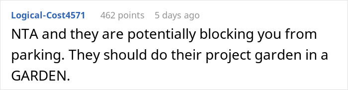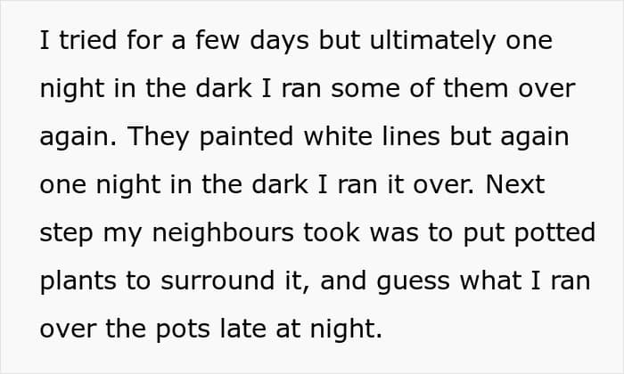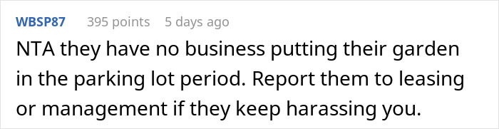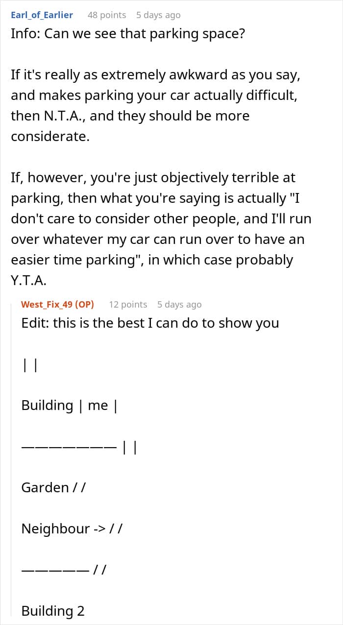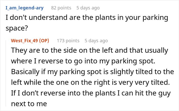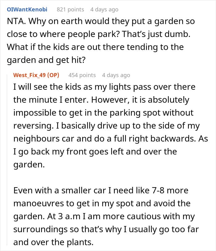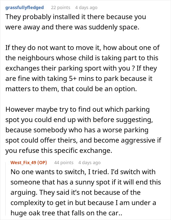 This sparked a conflict between the neighbors and the poster even suggested to swap parking spots with them, but they refused