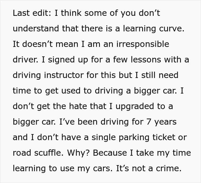 All in all, this led to OP catching a whole lot of flak about her being an awful driver. In her defense, 7 years of driving without any accidents at all is no small feat. According to her, she’s done it by simply learning the cars she drives well.