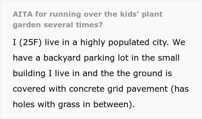 The poster came to the AITA subreddit to be judged if she’s a jerk for driving over a botanical project, flowers, which were planted in her driveway