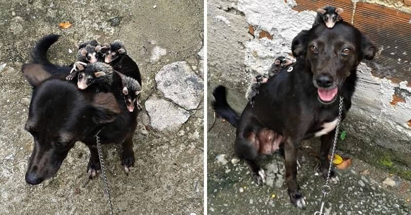 Dog Becomes Mother To Orphaned Opossums, Feeds Them With Her Milk, And Carries Them On Her Back