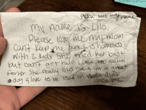 “Please keep my name. My name is Lilo. Please love me. My mom can’t keep me and is homeless with 2 kids,” the note began. “She tried her best but can’t get help. I cost too much for her. She really loves me & I’m a great dog & love to be loved on. Please don’t abuse me.”